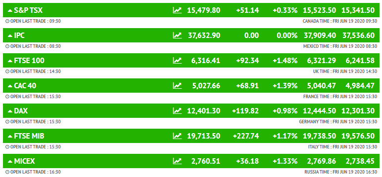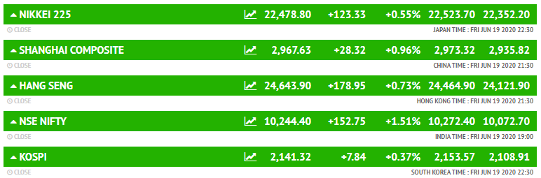 शुक्रवार को दुनियाभर के ज्यादातर बाजारों में बढ़त रही। जापान का निक्कई 123 अंक, चीन का शंघाई कम्पोसिट 28 अंक, हॉन्ग कॉन्ग का हैंग सैंग 178 अंक, भारत का निफ्टी 152 अंक और सेंसेक्स 523 अंक और दक्षिण कोरिया का कोस्पी 7 अंक की बढ़त के साथ बंद हुए। वहीं, इस समय यूके टाइम का FTSE 100, फ्रांस का CAC 40, जर्मनी का DAX, इटली का FTSE MIB, रूस का MICEX बढ़त में कारोबार कर रहे हैं।