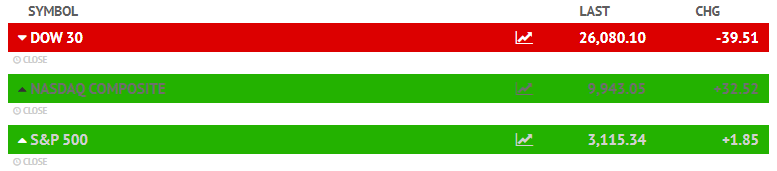 - गुरुवार को डाउ जोंस 0.15 फीसदी यानी 39 अंक की गिरावट के साथ 26080 अंक पर बंद हुआ था। नैस्डैक 0.33 फीसदी यानी 32 अंक की बढ़त के साथ 9943 अंक पर और एसएंडपी 0.06 फीसदी यानी 1 अंक की बढ़त के साथ 3115 अंक पर बंद हुआ था।