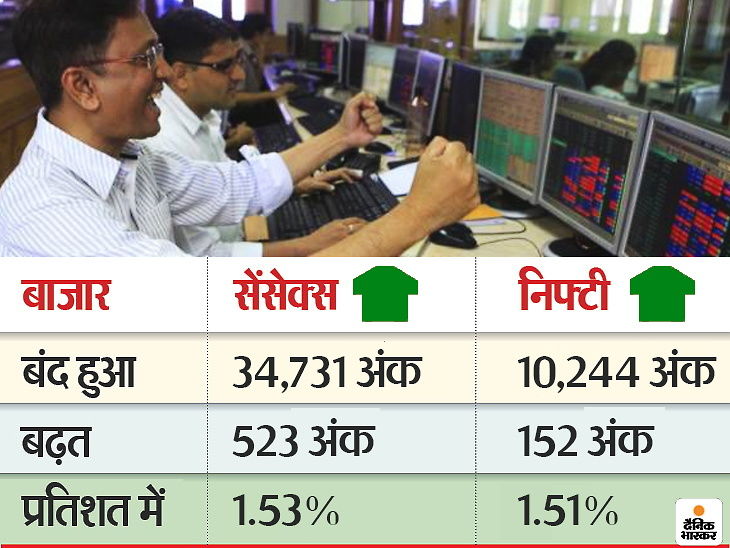 - कारोबार के अंत में बीएसई 523.68 अंक या 1.53% ऊपर 34,731.73 पर और निफ्टी 152.75 पॉइंट या 1.51% ऊपर 10,244.40 पर बंद हुआ। आज इंडियाबुल्स हाउसिंग फाइनेंस लिमिटेड के शेयर में 30 फीसदी की बढ़त रही। इससे पहले गुरुवार को बीएसई 700.13 अंक ऊपर 34,208.05 पर और निफ्टी 210.50 पॉइंट ऊपर 10,091.65 पर बंद हुआ था।